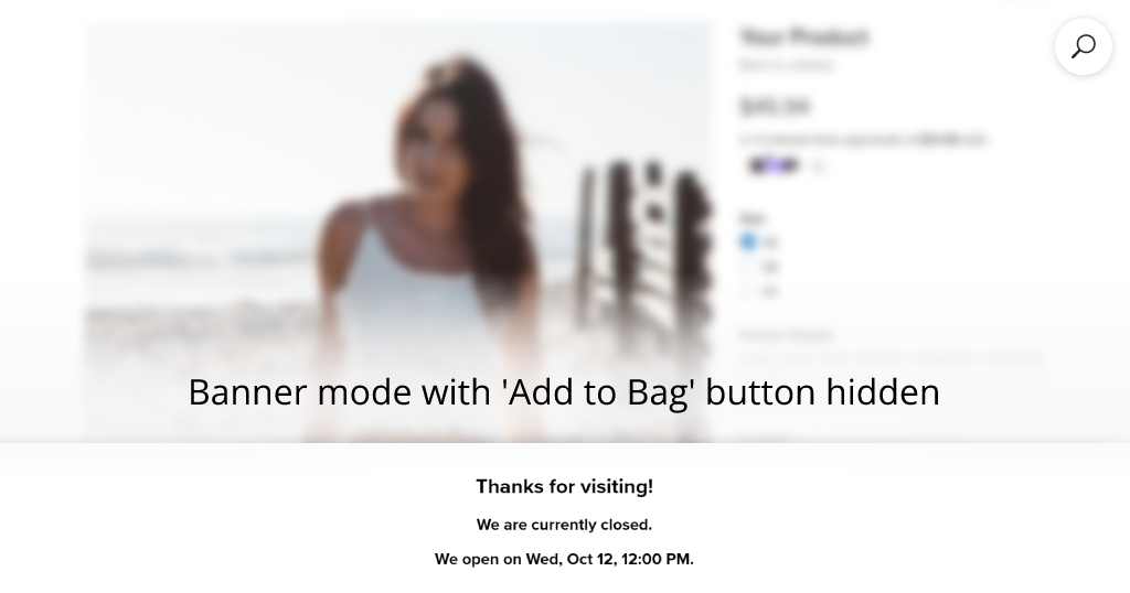 Turn ordering on and off on your shop based on your business hours. Your customers will know when you are open and be able to make new orders. Once you are closed, the ability to make new orders is disabled and a banner or fullscreen message is displayed to your customers. Avoid having a customer place an order while you are closed and unable to help them. Available also on the Ecwid by Lightspeed App Market.